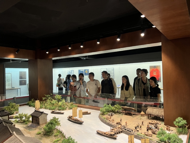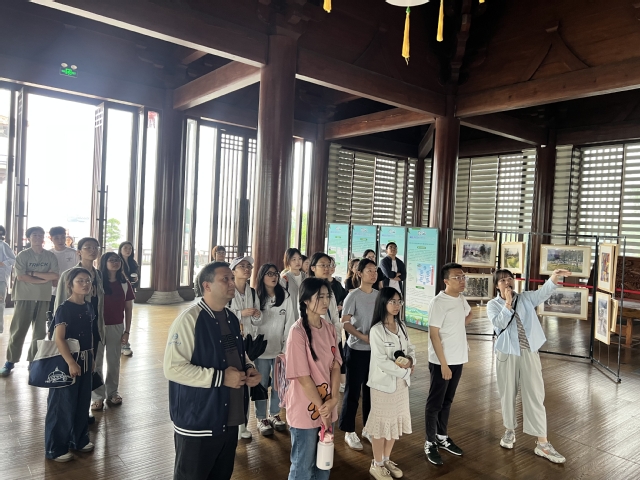 “浦江之首”是国家AAA级景区,因斜塘、圆泄泾、横潦泾三江在此交汇而得名,被誉为黄浦江的“零公里”起点。站在观景台上,师生们凭栏远眺,聆听着工作人员讲解黄浦江的地理变迁与水利历史。大大小小的江轮穿梭如鲫,鸣笛交会,散发着勃勃生机。随后,大家走进水文化博物馆,通过丰富的图文展板、实物模型和互动装置,系统了解松江地区从远古治水到现代水利的发展历程,理解“舟楫之利,以济不通,致远以利天下”的先人智慧。