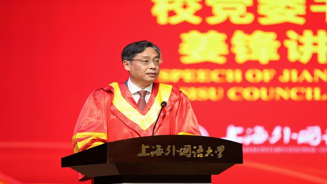 校党委书记姜锋代表李岩松校长向2020届毕业生送去了祝福。他在讲话中指出,在抗击新冠肺炎疫情期间,上外就有千余名师生投入抗疫活动,这体现出的既是上外人以专业所长为全球抗疫所作出的贡献,更是上外人的担当和奉献精神。在这样一个全球共同的艰难时刻,面对2020届毕业生,他提出四点希望。他希望大家能够“心中有国,胸怀天下”,以家国情怀作为上外人立足之本;“‘语’众不同,学无止境”,今后努力为国立言;“独立思考,把握人生”,在纷繁复杂的信息观点中坚守理性。他深情寄语毕业生:“为国担当”“天下己任”“人文情怀”既要言说,更要付诸实践。只有付诸实践,宏大的叙事才有意义,伟大的梦想才能实现,期待的美好才能出现,事在人为,为人由己。