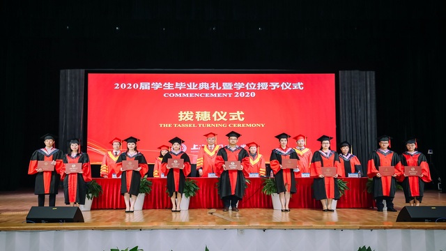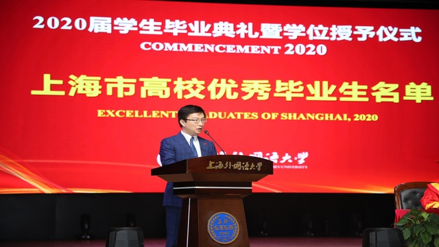 毕业典礼中,校领导为2020年上海市高校优秀毕业生代表颁发了荣誉证书及奖杯,为2020届毕业生代表拨穗并颁发学位证书。校学工党委书记王一林宣读了2020年上海市高校优秀毕业生名单。全校教师代表在视频《远航》中分享了同学们的成长故事,并以多语种诗歌朗诵的方式表达了对毕业生的真挚祝福。视频《想见你》,则以情景短片的形式,回顾了毕业生们在上外所经历的点滴与蜕变。