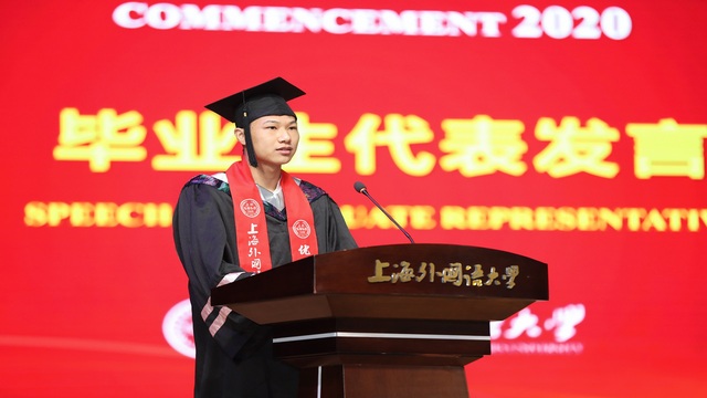 毕业生代表,来自国际工商管理学院的孙峻梓同学与大家分享了自己的求学故事与抗疫经历。在上外的求学经历,让他明白学习能力与独立思考的重要性;疫情期间担任志愿者的经历,则让他领会到“上外人的志向不在口号中,而在祖国召唤时的行动中”。最后,他号召同学们“勇敢地走出校门,开启我们的故事吧!未来一定有无限可能!”