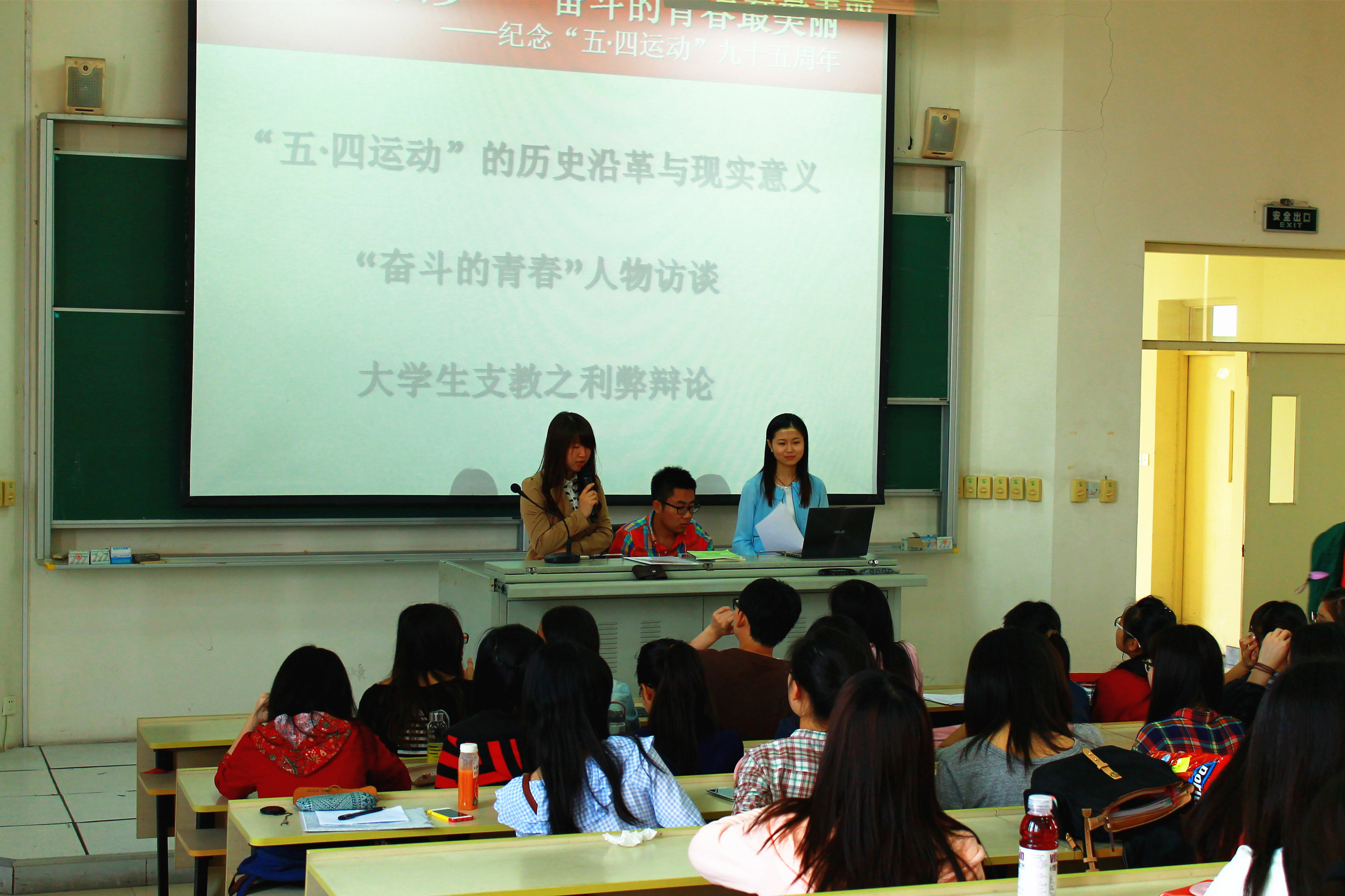 活动现场,2012级英语教育专业的同学首先介绍了“五四运动”的历史沿革和现实意义,并以视频展示了以“奋斗的青春”为主题的师生访谈,生动阐释了五四运动对于当代青年的启示和导向性意义。2013级英语教育专业两个班级的代表则以“大学生支教的利弊”为题展开辩论,同学们对自己的观点进行了有理有据的阐述,在思想火花的碰撞中,参与辩论的同学和现场观看的其他学员们都更明确了我们该如何以正确、端正的态度对待支教,以及如何正面、积极、有效地实践支教活动。展示结束后,辅导员老师和各班团支书为每个班级评测打分。