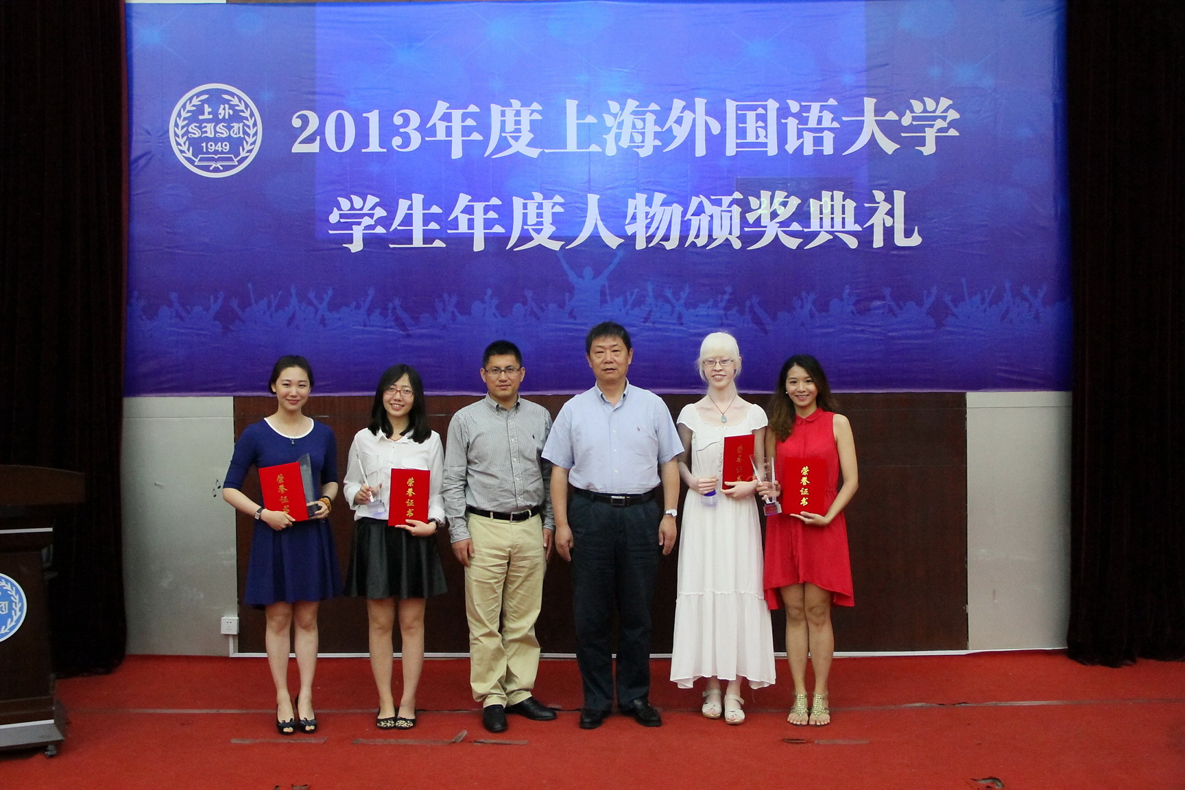 5月28日下午,“2013年度上海外国语大学学生年度人物”颁奖典礼在松江校区图文西厅隆重举行,校党委副书记李月松出席了此次颁奖典礼。参加此次活动的还有各院(系)党总支书记和辅导员老师及全校各院系学生。经过院系推荐、易班线上线下学生投票以及专家评审等环节,国际金融贸易学院金怡、传媒学院贾玮、国际教育学院王思杰、西方语系贾诗慧、德语系李卓亚五名学生被评选为2013年度上海外国语大学学生年度人物,其中王思杰同学同时获得上海市大学生年度人物荣誉称号,这也是我校学生连续第四次获此殊荣。
