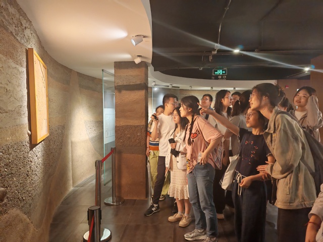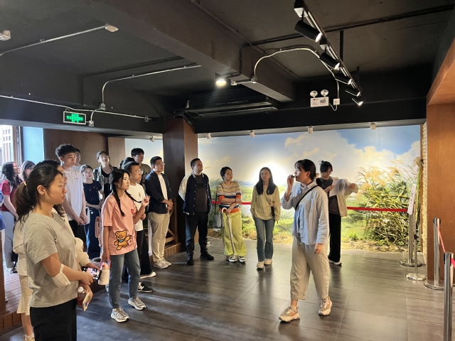 “浦江之首”是国家AAA级景区,因斜塘、圆泄泾、横潦泾三江在此交汇而得名,被誉为黄浦江的“零公里”起点。站在观景台上,师生们凭栏远眺,聆听着工作人员讲解黄浦江的地理变迁与水利历史。大大小小的江轮穿梭如鲫,鸣笛交会,散发着勃勃生机。随后,大家走进水文化博物馆,通过丰富的图文展板、实物模型和互动装置,系统了解松江地区从远古治水到现代水利的发展历程,理解“舟楫之利,以济不通,致远以利天下”的先人智慧。
