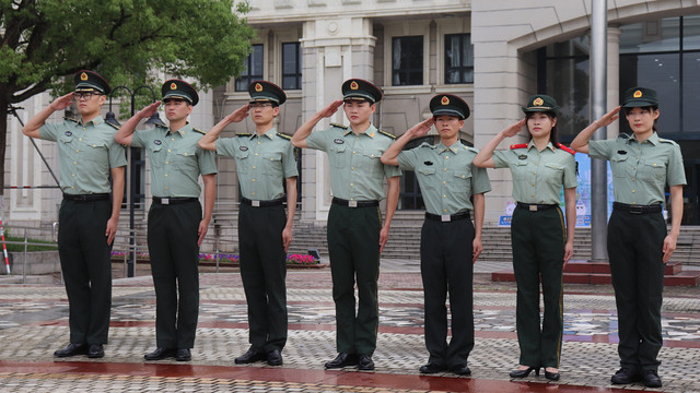 2021年6月11日上午8点,旭日东升,辉耀上外。2021届退伍毕业生“感恩母校,再致军礼”升旗仪式在松江校区图文广场前举行。校武装部彭元明老师和李光瑞老师出席该仪式。