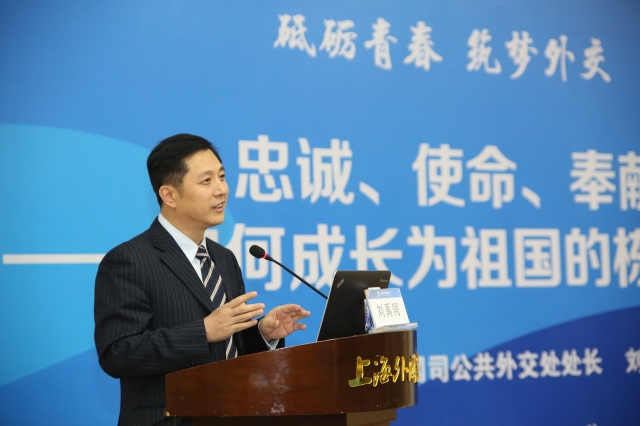 12月9日,外交部新闻司公共外交处参赞兼处长刘禹同应邀为我校学生作了题为《忠诚、使命、奉献——如何成长为祖国的栋梁之才》的专题讲座。下午两点,讲座在松江校区图文信息中心东厅举行,现场座无虚席。