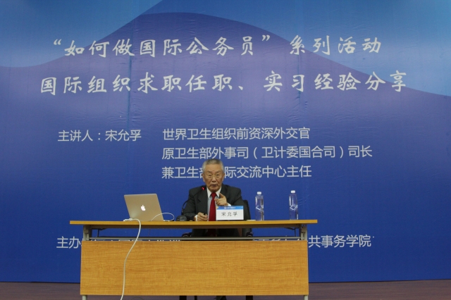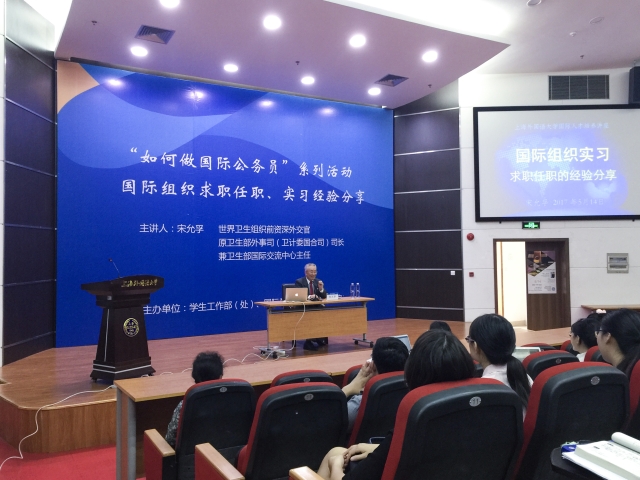 5月14日下午,世界卫生组织前资深外交官、原卫生部外事司(卫计委国合司)司长、兼卫生部国际交流中心主任宋允孚在松江校区图文信息中心西厅为全校师生带来题为“如何做国际公务员——国际组织求职任职、实习经验分享”的讲座。